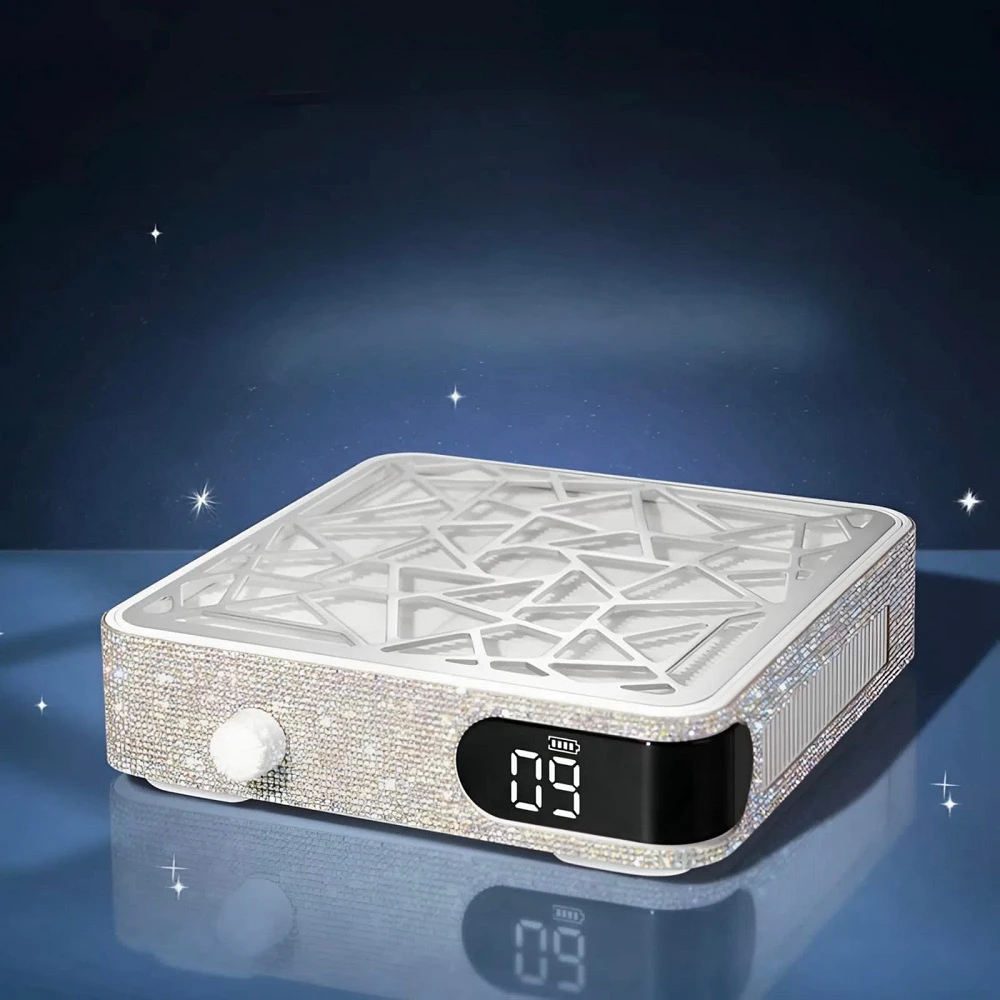 2. Стил и елегантност: Диамантите или декоративните камъни, вградените в устройството, придават на прахоуловителя изискан и луксозен вид, което го прави подходящ за професионални маникюристи, които искат да съчетаят функционалност с естетика.