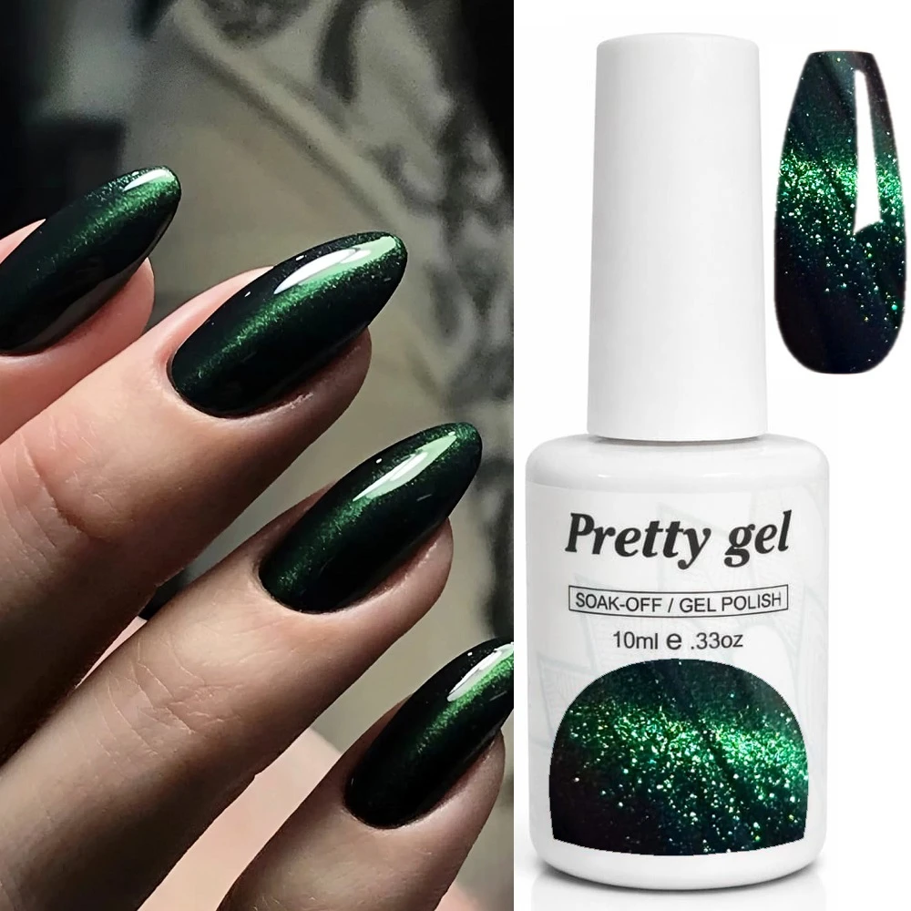 Колекцията “Котешко око” лакове на Pretty Gel предлага атрактивни цветове, които съдържат малки метални частици,  подредени по определен триизмерен модел. С помощта на класически магнит за котешко око се получава  невероятен триизмерен ефект.
