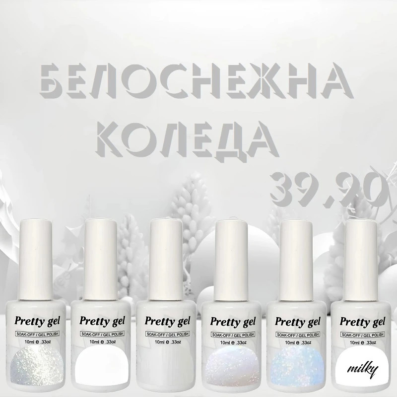 Комплект Белоснежна Коледа – 6 гел лак Pretty различни бели + ПОДАРЪК