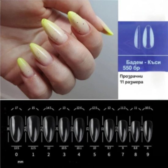 Пълно покритие на нокътната плочка. 550бр. в кутия – 11размера в кутия (МОЛЯ, обърнете внимание, че на кутията е сгрешен броя на размерите, реално са 11 размера общо 550бр.)